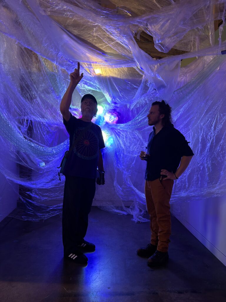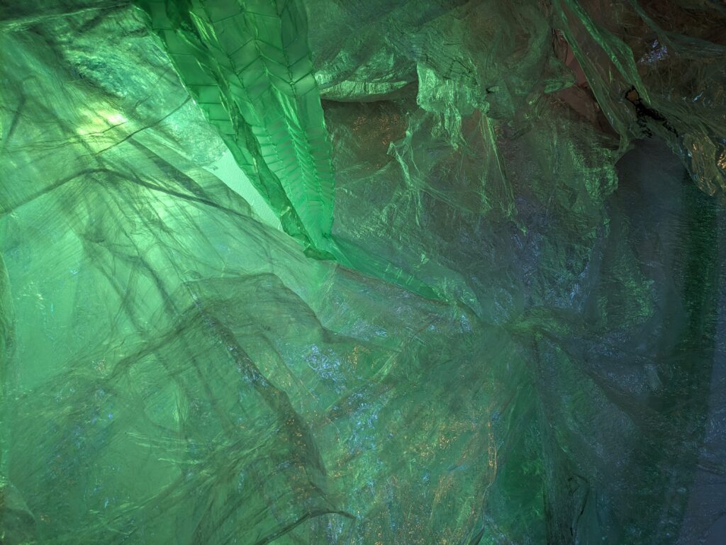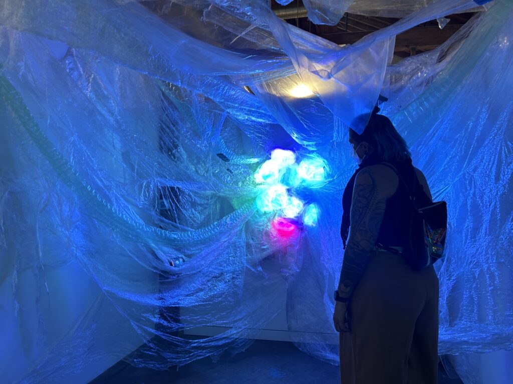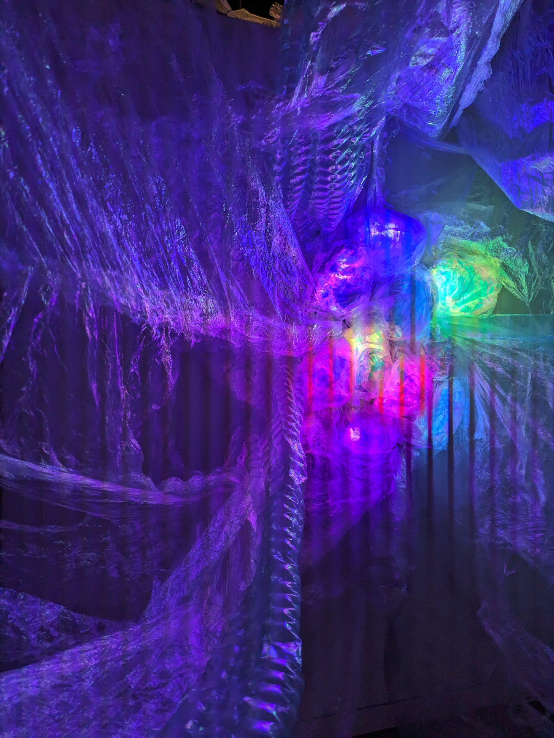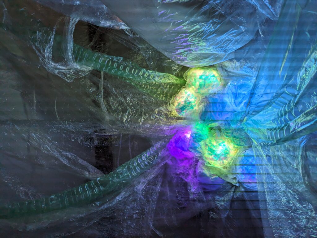 Synthetic Accretion explores AI and plastic as parallel components of an emergent synthetic human experience. Through recovered transparent plastic waste, and shifting multicolored light, the installation mirrors the disorientation and ambient technological allure of contemporary cultural networks.